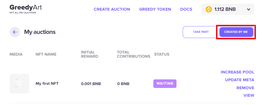 3. Click on CREATED BY ME on the page's tab switcher. A list of all the auctions you've created will be displayed.
