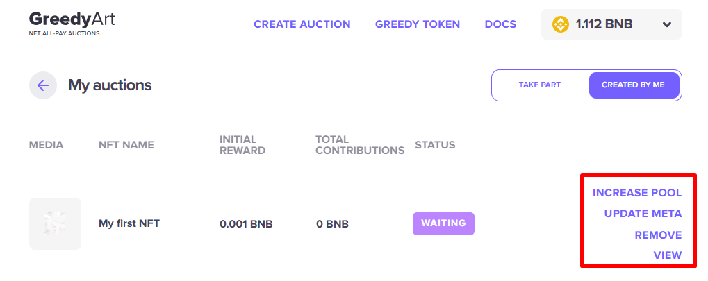 * REMOVE - a button to delete the auction. After clicking, you will need to confirm the transaction in your wallet.