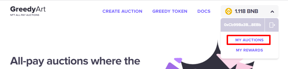 2. In the top right corner of the screen, expand the dropdown menu by clicking on the wallet balance area and select My auctions.